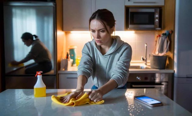 The spray bottle clicked like a metronome in the small kitchen. A woman in a gray hoodie was polishing the same square of countertop, long after it stopped reflecting her face. *Her hands moved faster than her thoughts.* She wasn’t preparing for guests. She wasn’t chasing dust. She’d just read a message she didn’t want to answer. The cloth did the answering for her, swiping in even lines, a ritual against a feeling she couldn’t name. I watched the suds go from cloudy to clear, and her shoulders drop half an inch. The room got cleaner. The worry stayed. What was she really scrubbing?