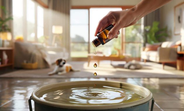 The method is almost embarrassingly simple. Fill your mop bucket with warm water, add your usual floor cleaner if you use one, then pause before dipping the mop. Take your chosen essential oil – lavender, eucalyptus, orange, or a mix you love – and slowly let two drops fall into the water. Not five, not ten. Two. Then stir gently with the mop, as if you’re whisking a slow soup.