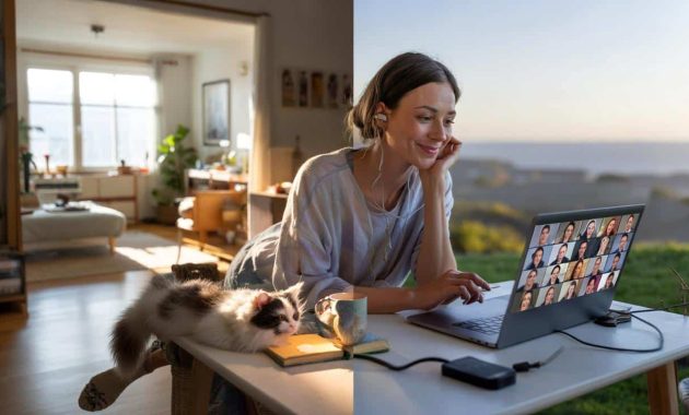 At 8:59 a.m., Anna is still in her slippers. Laptop open on the kitchen table, coffee going lukewarm, cat aggressively sitting on her notes. On the screen, 23 little circles with initials: the Monday team meeting. Her manager appears, slightly backlit, slightly annoyed. “I’d like to see more cameras on,” he says. Half the circles stay dark. Anna unmutes for exactly 14 seconds, delivers her update, then slips her headphones off and breathes out. No crowded subway, no badge to scan, just a quiet apartment and a day she can shape a little more on her own terms.
