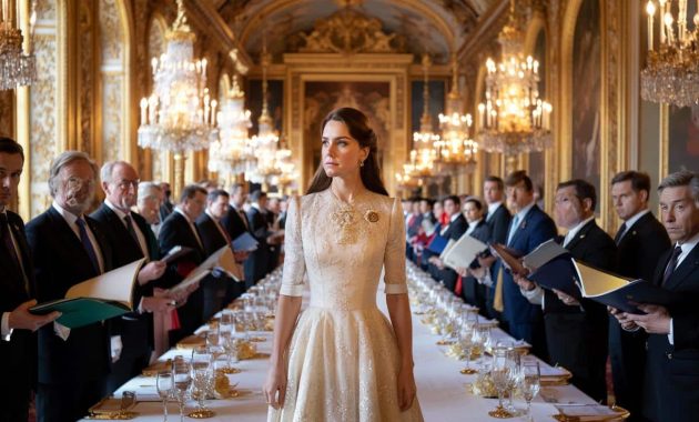 Die Szene wirkt fast wie aus einem Film: Ein langer Saal, goldene Stuckdecken, Kerzenlicht spiegelt sich in Gläsern. Staatsgäste aus aller Welt, steife Haltung, kontrollierte Mimik. Dann tritt Kate Middleton ein – in einem cremefarbenen, spitzenbestickten Kleid, das zwar klassisch ist, aber trotz allem ein kleines Statement abgibt.