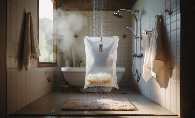 The method sounds almost too simple. You buy a moisture absorber bag from the cleaning aisle – the kind with crystals at the top and a small pouch at the bottom. Then you hang it as close as you can to the steamy zone: on the shower rod, on a hook by the tiles, or from a towel rack. That’s it.