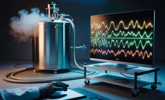 Pumps thrum. A vapor plume hovers near a steel cylinder, the kind that swallows light and time. A laptop screen glows on a rolling cart, cables wandering off like ivy. The lines on the display shimmer and coil—waves that seem to breathe.