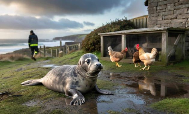 The pup, thought to be a juvenile grey seal, had somehow left the beach, crossed a coastal path and squeezed under a gate before settling beside a chicken run. For the surprised homeowner, the scene felt surreal: countryside sounds, a battered lawn and, right by the chicken coop, a wide-eyed marine mammal.