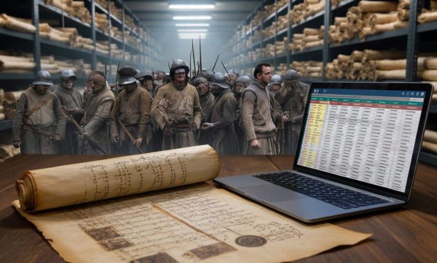 The archive room is colder than it should be. That particular kind of chill that smells of dust, old glue, and someone else’s handwriting. A researcher flips through a parchment roll, lips silently mouthing unfamiliar names: “Robert de Hales… William Bowet… arrows, 120… paid 3 pence… exempted from service.”