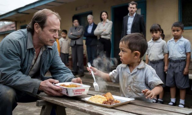 The boy’s hands were shaking so hard the plastic fork rattled against the cheap paper plate. His school uniform was too small, socks falling, collar half-torn. In front of him, a man in a faded jacket gently slid a steaming box of food across the bench. Parents watched. Teachers watched. Nobody moved.
