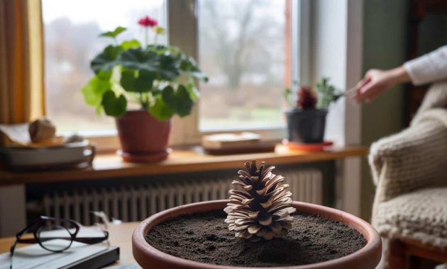 The scene almost always looks the same: a living room slightly overheated, a window sweating with condensation, and a drooping houseplant trying to survive the radiator season. Then an older relative arrives, takes off their coat, squints at the dry soil… and quietly places a pine cone on top of the pot. No explanation. No YouTube tutorial. Just a small, almost ceremonial gesture passed down without a word.